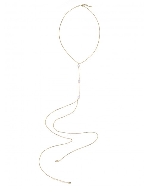 This jewel was made in Tuscany, the heart of Italian jewelry craftsmanship. Its design combines the shine of the diamond cut chain, the noble light of the white pearls and the charm of 18kt gold plating. Simple to put on, comfortable to wear, adds to your look a ray of precious shine like Mediterranean sun. It matches well to home, party, casual outfits. Completely polished. Comfortable and safe clasp. 18kt gold plated (1mc comm). Length of the necklace 22”, the central part with pearls 5”, the lower part 33”. 3 fresh water pearls mm6x8. Gift pouch available.