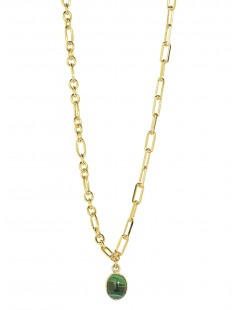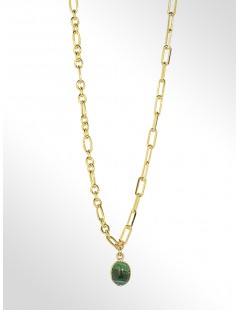 This jewel was made in Tuscany, the heart of Italian jewelry craftsmanship. Its design combines the shine of the diamond cut chain and the magic of the natural malachite. Simple to put on, comfortable to wear, adds to your look a ray of precious shine like Mediterranean sun. It matches well to office, home, party, casual outfits. Completely polished. Comfortable and safe clasp. Can be worn alone or with other chains and necklaces. 18kt gold plated (1mc comm) plated. Natural malachite cabochon mm8x10. Length 17’’+2’’. Gift pouch available.