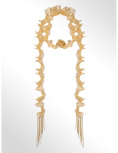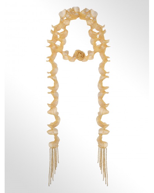 Avvolgiti nell’eleganza della Toscana con questa raffinata sciarpa in tessuto a mesh placcato oro 18kt, impreziosita da un delicato dettaglio floreale. Ogni riflesso cattura la luce come un raggio di sole mediterraneo, illuminando con preziosa brillantezza il tuo look. Leggera e versatile, può essere indossata in diversi modi, secondo il tuo stile e il tuo umore.