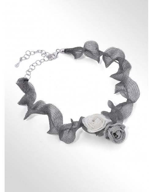 Choker in argento 925 placcato rodio nero, realizzato con un delicato tessuto impreziosito da 2 dettagli floreali. Un gioiello che non passa inosservato e che illumina il tuo look con una luce misteriosa. Leggero, confortevole e piacevole al tatto.
